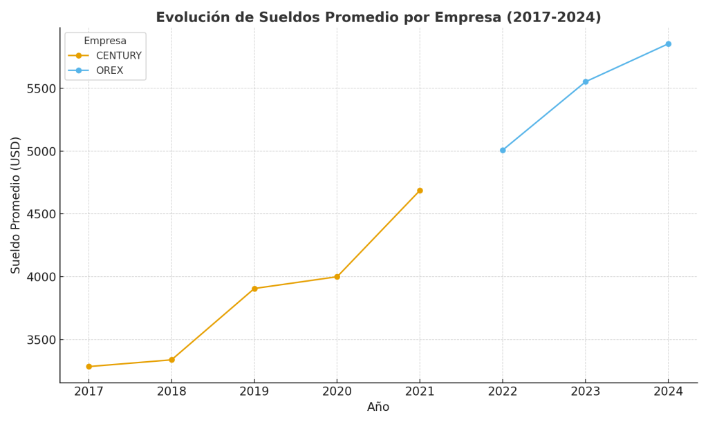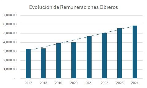La evolución de las remuneraciones de los obreros en los últimos ocho años muestra un crecimiento sostenido y progresivo. La gráfica muestra que los salarios promedio han pasado de 3,285.02 en 2017 a 5,853.75 en 2024, un incremento acumulado de casi 80%. Durante la gestión previa (Century 2017–2021) las remuneraciones crecieron de manera constante, 43% en cinco años. Minera OREX (2022–2024), consolidó una tendencia aún mayor, con incrementos superiores al 16% en apenas tres años. La tendencia en la gráfica confirma que este crecimiento no es circunstancial, sino parte de una política sostenida de mejora salarial, priorizado a nuestra fuerza laboral, garantizando una mejora continua en sus ingresos.